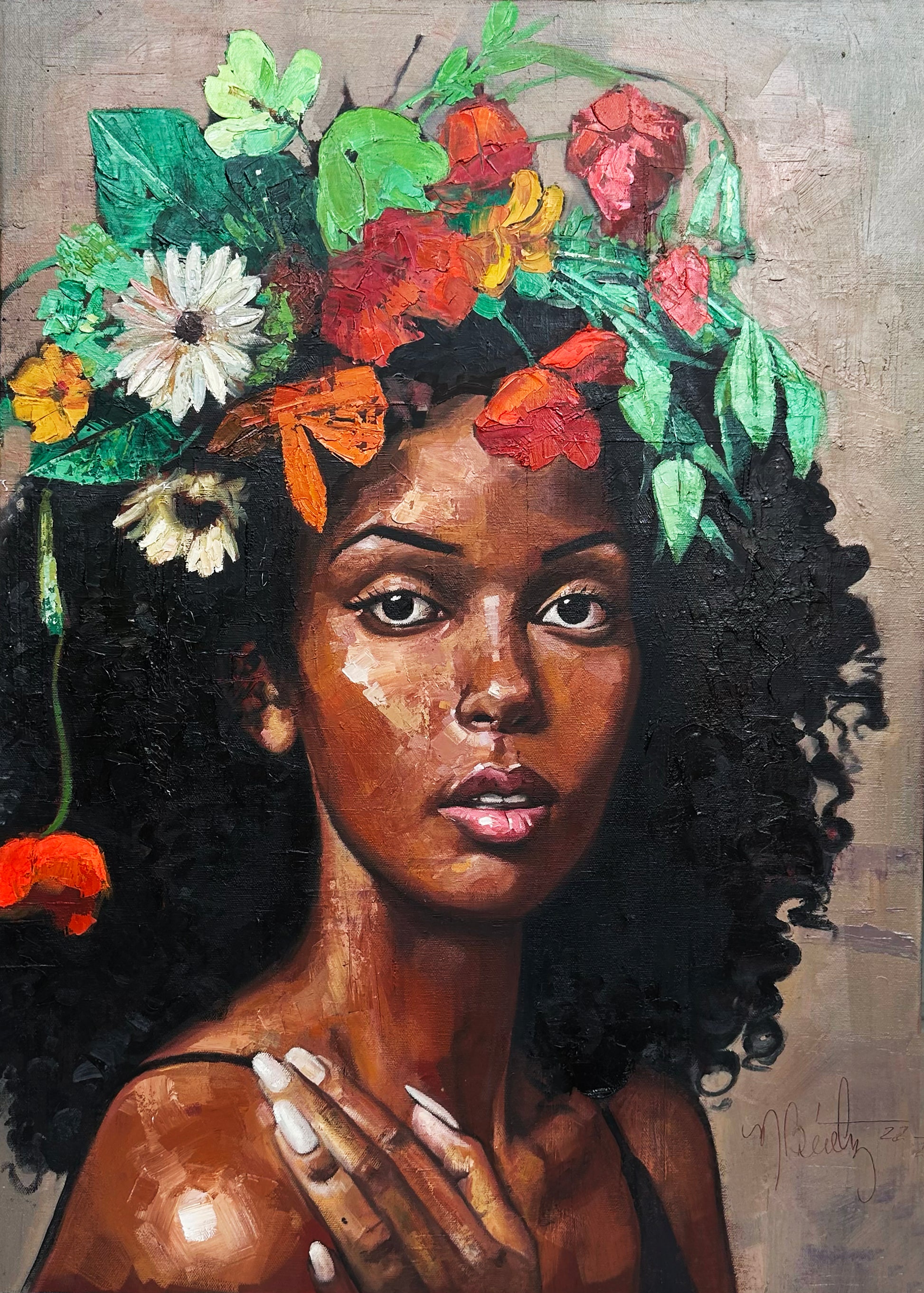Bella, an oil painting by Cuban artist Maikel Benítez, presents a striking interplay between realism and expressive texture. The artist juxtaposes the naturalistic rendering of the woman’s face with boldly textured, almost sculptural strokes in the crown of flowers, creating a harmonious tension between delicacy and vibrancy. Her rich copper skin tones glow against the jubilant blossoms emerging from her hair, evoking themes of renewal, rootedness, and inner flourishing. Her gaze—steady, unguarded, and gently luminous—anchors the composition, drawing the viewer into a sphere of contemplative stillness. The result is a portrait that feels both intimate and elemental, a quiet celebration of resilience and blooming self-possession.