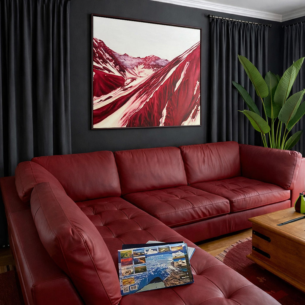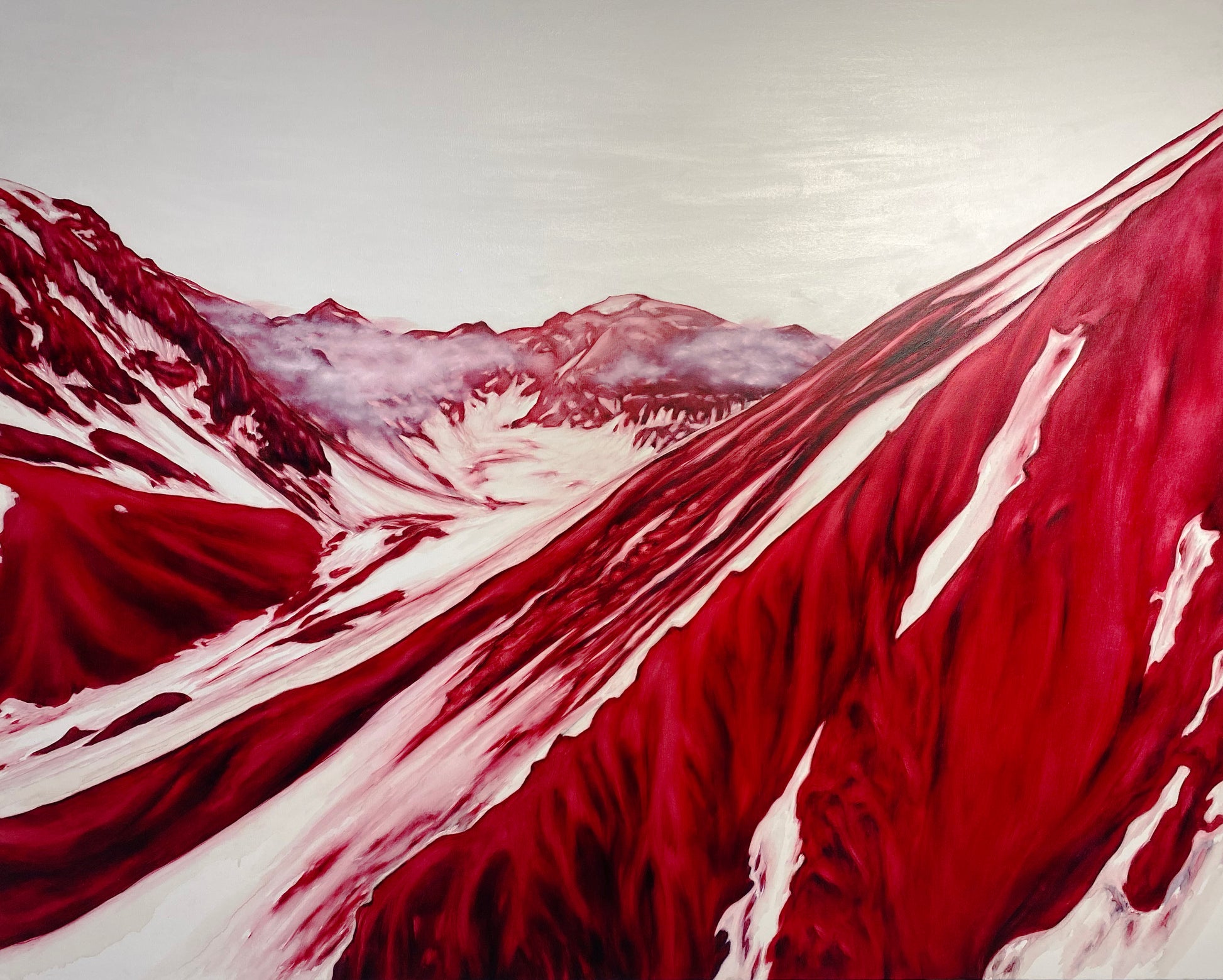 From his “Latitude Malbec, a journey through Rouge Senses" series, Argentinian-American artist Miguel Perez Lem reimagines the Andes Mountains through the sensorial language of Mendoza’s iconic wine. In this striking oil painting, the rugged slopes dissolve into an avalanche of silky, deep-crimson hues—echoing the richness, body, and texture of Malbec itself. The landscape becomes both geological and liquid, a place where mountains seem to pulse with the warmth and vitality of poured wine. Mist drifts across the peaks like a soft exhalation, creating a tension between power and serenity. The overall feeling is immersive and intoxicating: a terrain transformed by memory, culture, and taste, inviting the viewer to experience the Andes not just as a place, but as a sensation—lush, velvety, and resonant.