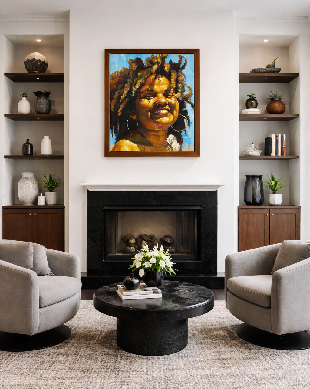 This artwork doesn’t just live on the wall; it anchors the room emotionally. It transforms the fireplace area into a place where people naturally gather, pause, and connect. Every time I look at it, I’m reminded of why I chose it—it brings joy, presence, and soul into my home.