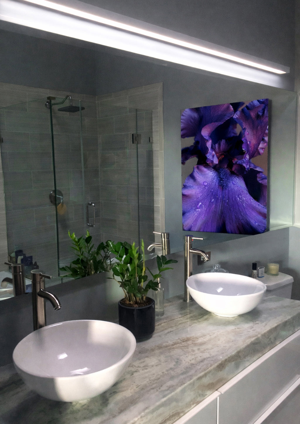 This photograph printed on aluminum was exactly that. The material immediately made sense for a bathroom—durable, resistant, and effortless to maintain—while the image itself brings depth, texture, and a natural presence that feels calm yet powerful. The colors shift beautifully with the light, and the finish feels contemporary without being cold.