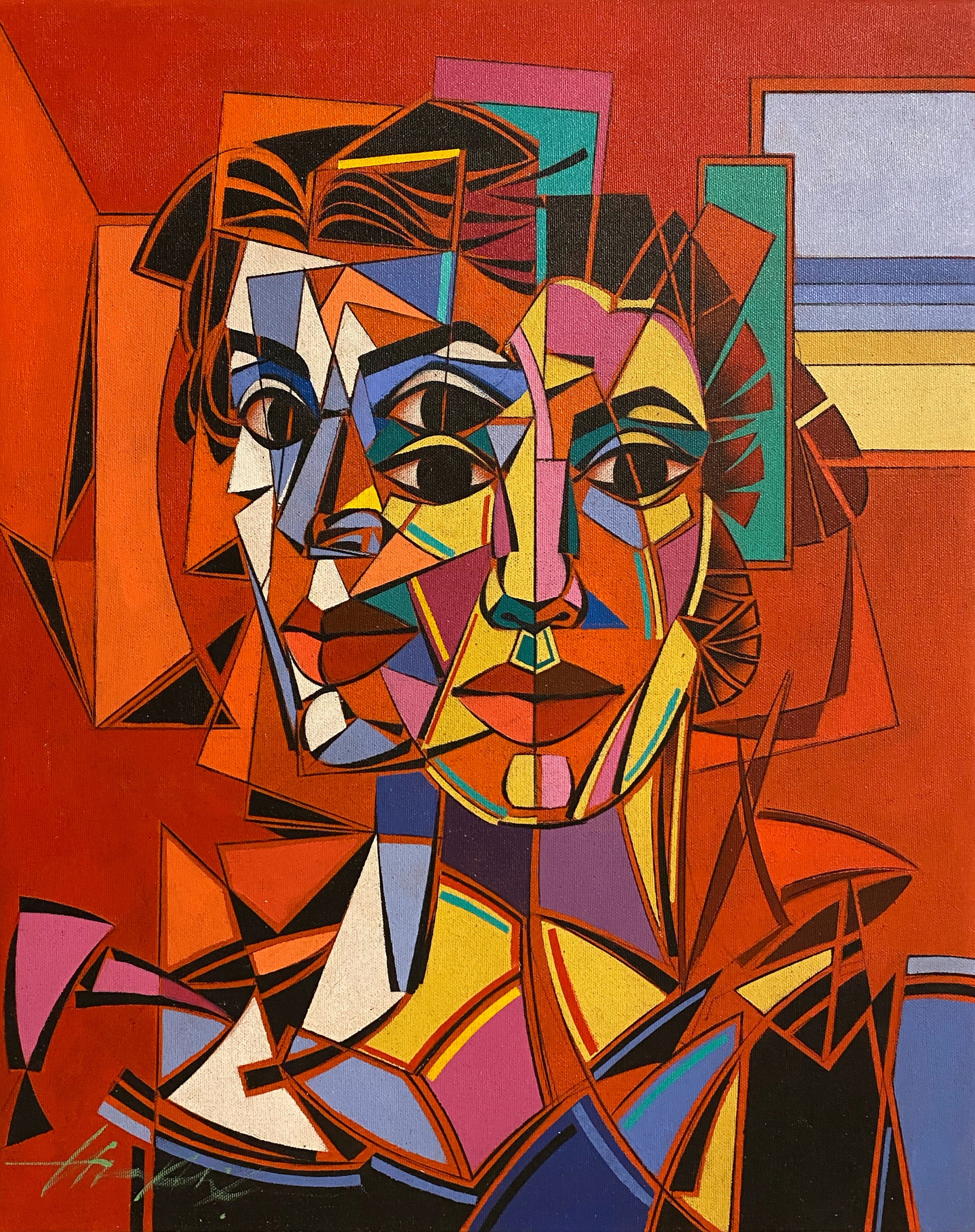 In Janela ao Mar, the vivid, prismatic portrait pulses with a profound emotional duality. What appears at first to be two figures may instead be a single presence fractured into overlapping selves—an echo of shifting identities and the layered inner landscapes we inhabit. The distant window and quiet sea serve as a symbolic counterpoint, suggesting escape, reflection, or the promise of elsewhere, while the warm, angular composition radiates tension and inner movement. Through this interplay of fragmentation and harmony, Janela ao Mar captures the fleeting, ever-shifting nature of selfhood itself.