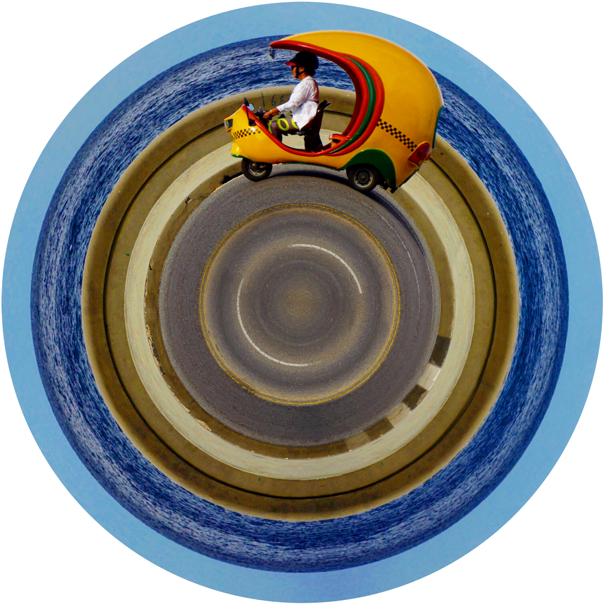 “360° in the World” is a photographic collection by Miguel Perez Lem, captured across diverse locations around the planet. Using Photoshop, each photograph is artistically transformed—bent and reshaped to create a unique visual journey through tiny worlds: self-contained planets born from real landscapes.