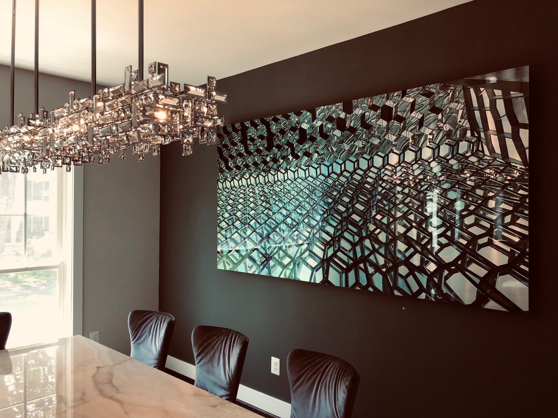 What I love most is how elevated the dining room feels now. The art anchors the space, the wall color adds drama, and the lighting brings it all together. Thanks to White Cloud Gallery’s thoughtful guidance, this room is no longer just where we eat—it’s where we gather, connect, and create lasting memories.