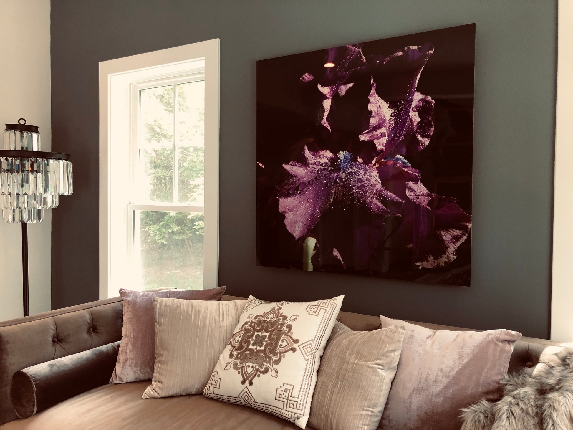 The flower printed on metal feels alive, both delicate and powerful. Throughout the day, it quietly transforms as the light shifts—not only with the viewing angle, but with the changing light in the room. At times it nearly disappears; at others, it fully blooms, revealing a dramatic, moody elegance that feels almost sculptural.