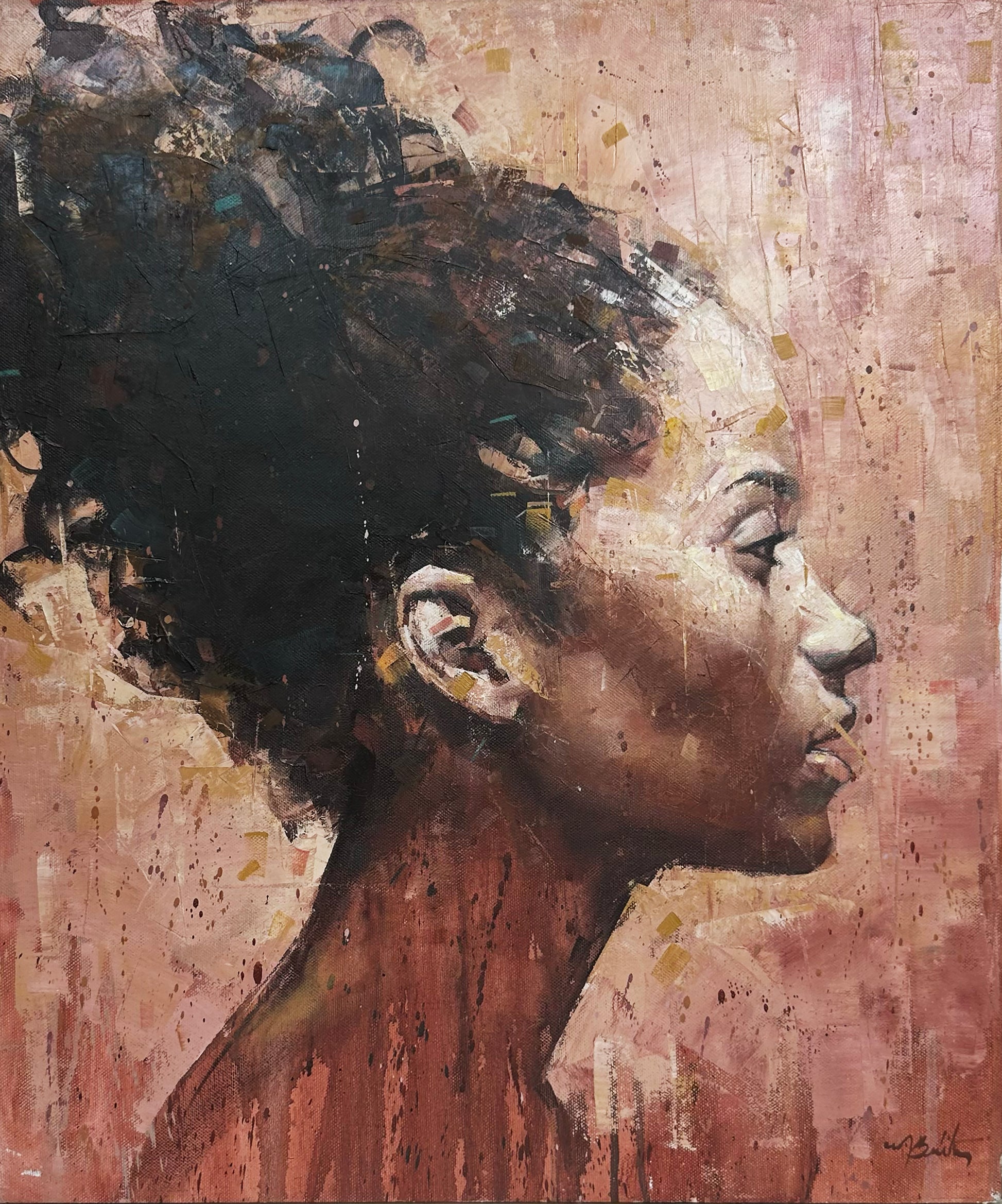 Benítez’s layered, expressive brushwork builds the face and neck through earthy browns, warm siennas, and softened pinks, allowing light to emerge gradually from within the surface. Flecks and drips of paint animate the background, creating a subtle emotional atmosphere that feels lived-in, like memory settling into form. Her dark hair, gathered and textured, becomes an extension of the surrounding space, reinforcing the painting’s organic unity.