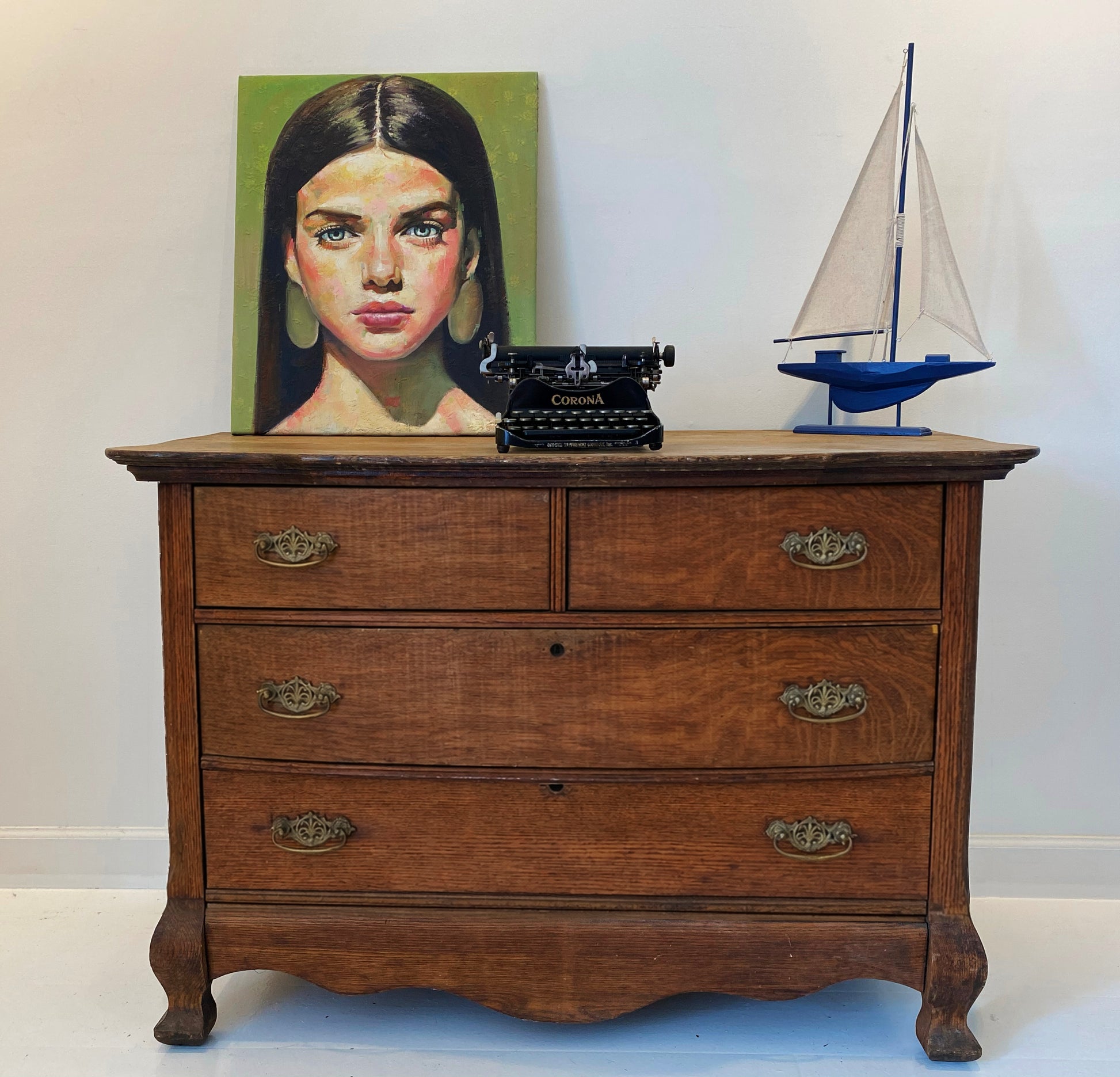The antique sideboard and the vintage typewriter echo the emotional depth of the portrait, grounding it in a sense of lived history and personal narrative. Her steady gaze, fixed on the horizon, suggests an inner correspondence—as if she were writing letters filled with hope to someone who has sailed away.