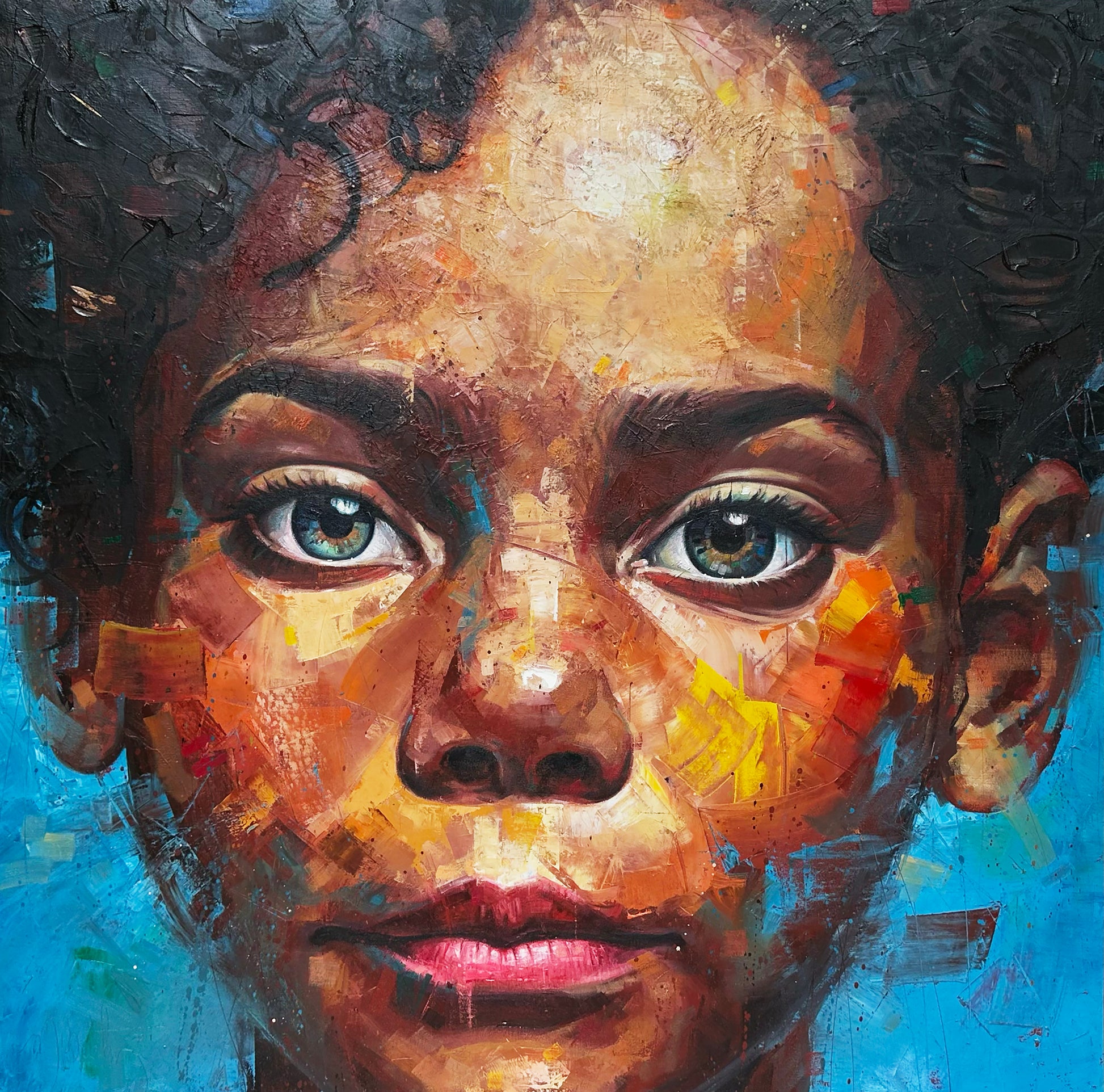 “Through His Eyes,” by Cuban artist Maikel Benítez, is a vivid portrait composed through layered brushstrokes—at once chaotic and exquisitely controlled—that shape a face both intimate and monumental. Though Benítez’s work is known for its vibrant colors, rich textures, and almost electric energy, the child’s gaze remains strikingly calm and profoundly expressive.